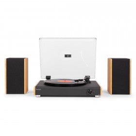 El conjunto RP335 es una elegante combinación de diseño vintage combinado con características modernas. El tocadiscos está equipado con dos altavoces estéreo de rango completo de 40 W, lo que te proporciona un conjunto de sonido completo y también potencia suficiente para llenar las habitaciones más grandes de la casa con tu música favorita. El RP335 es un tocadiscos de 3 velocidades (33 1/3, 45 y 78 RPM) y está equipado con tecnología BT incorporada para transmitir música de forma inalámbrica desde cualquier dispositivo habilitado para BT. También puede convertir el vinilo en un archivo digital usted mismo mediante la grabación USB directa.